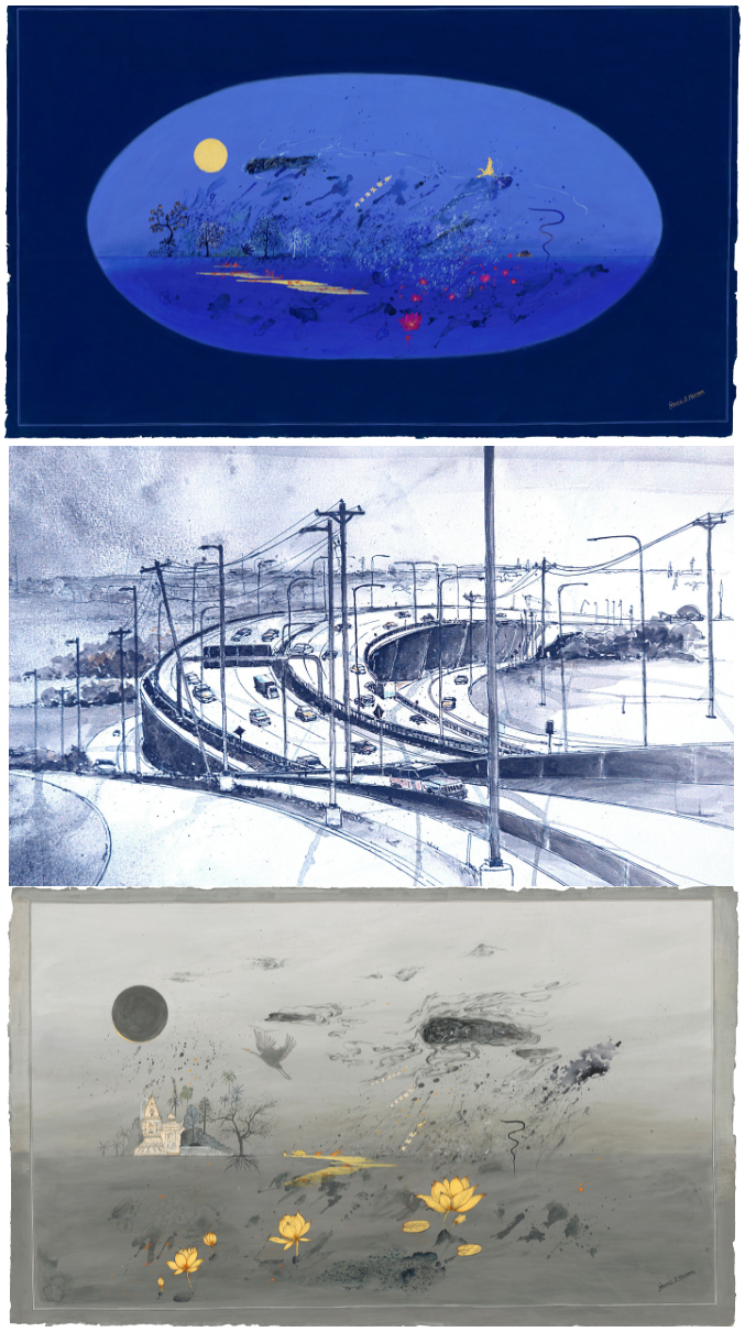 Win On Fine Art is a collective featuring the work of a husband-and-wife artist duo: iconographic, fantastical landscapes using minerals, stone pigment on handmade hemp paper, and sculptures that reveal ancestral artifacts, and everyday objects by Gaurii S Kumaar, and urban sketches on location using pen and ink on paper by Sudeep Kumar.